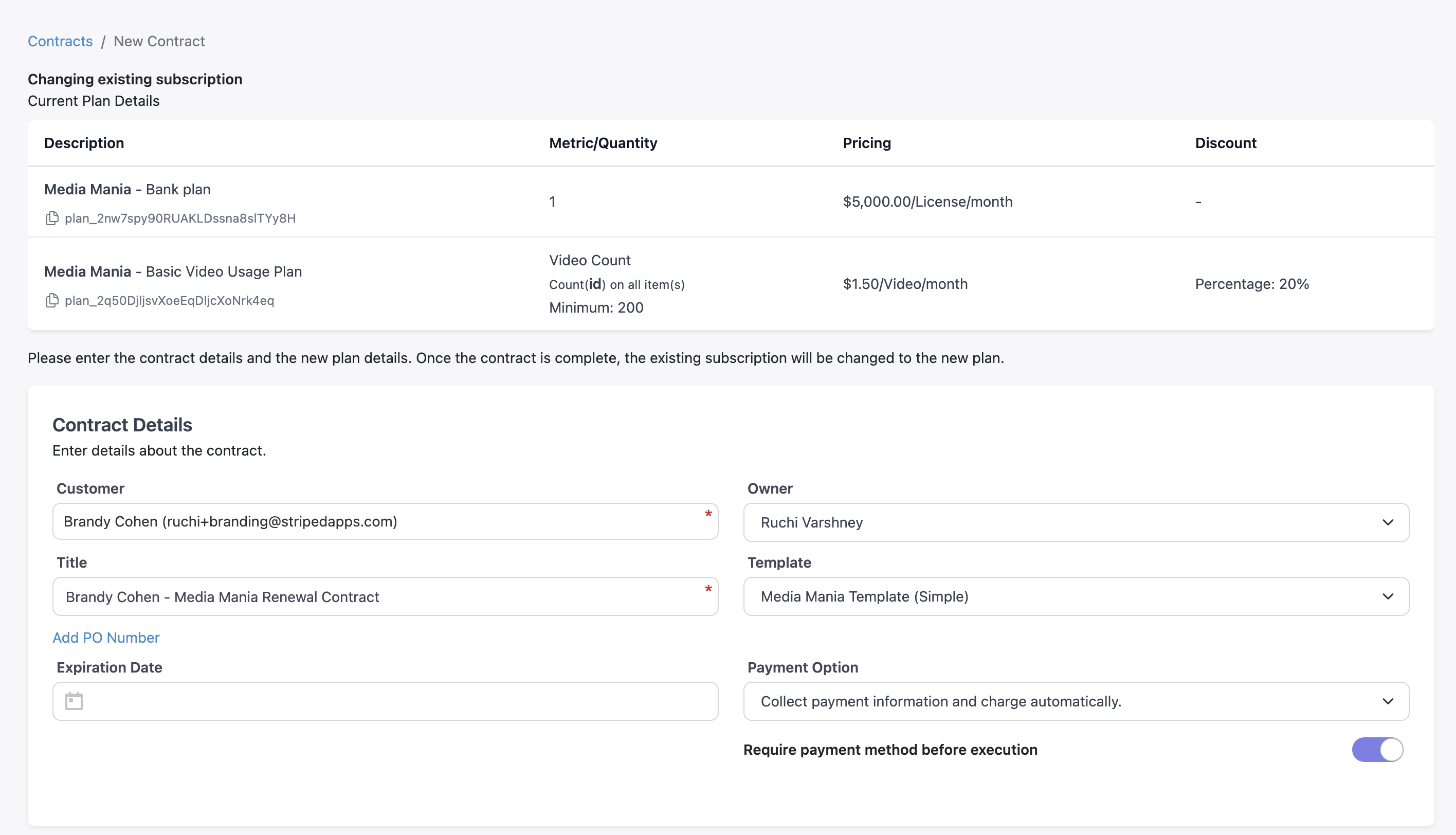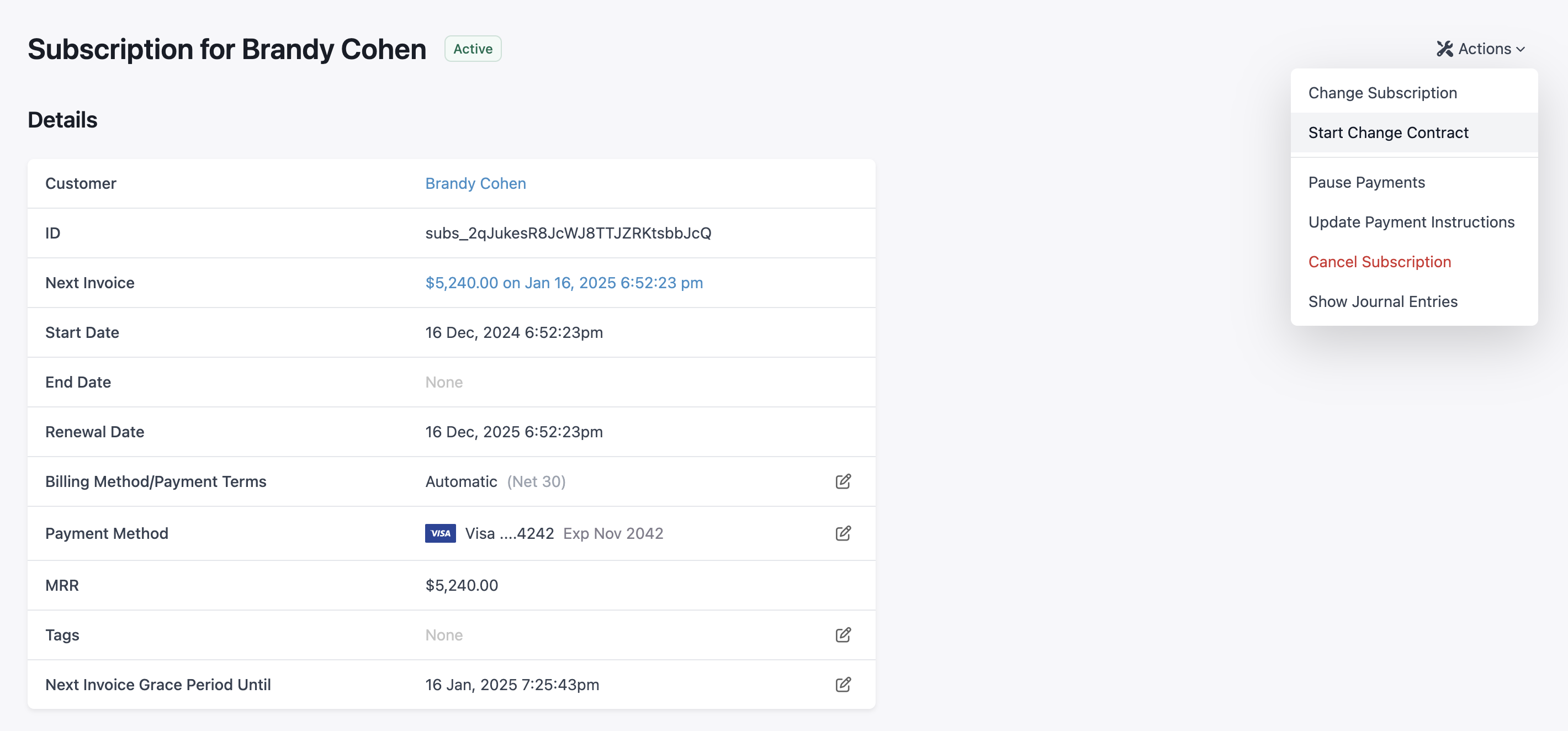 Once you click the link on the subscription that is up for renewal or any subscription that needs to be changed, you can start a change contract to ensure that any changes can be signed off on by your customer.
