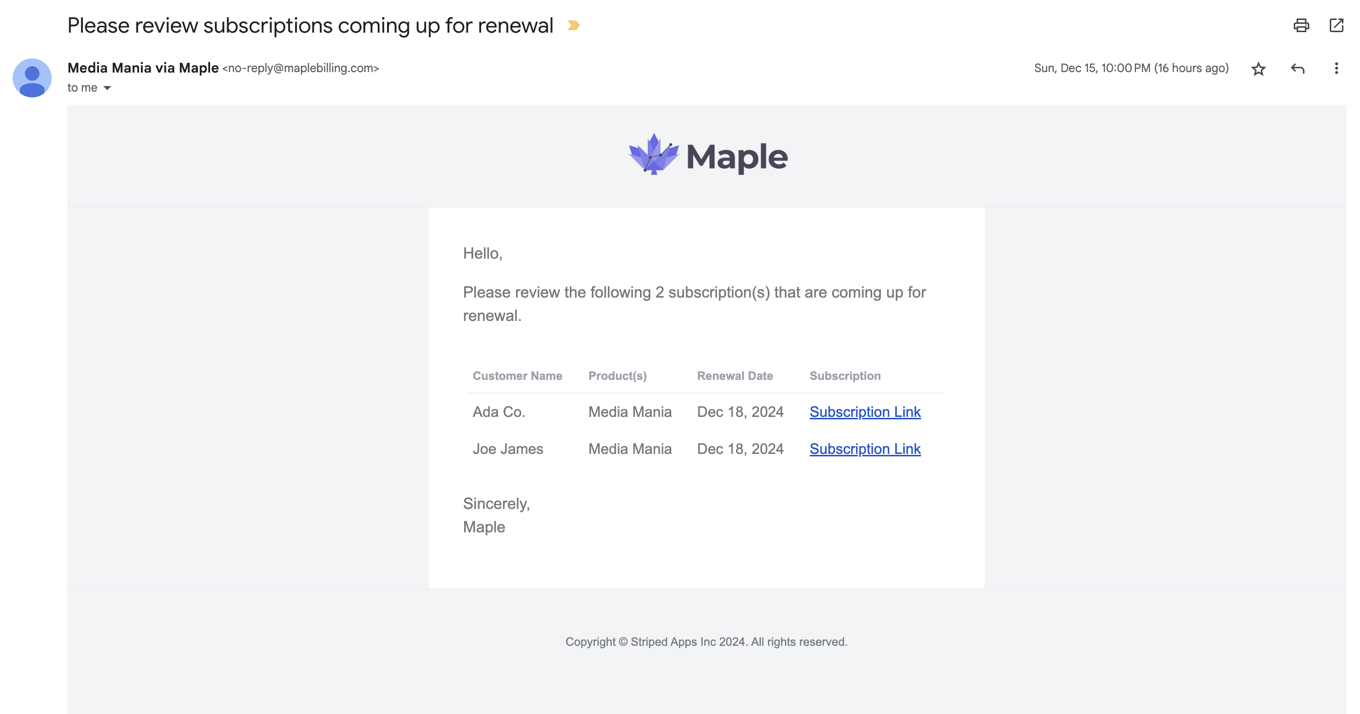 Renewal reminder emails can be configured to ensure that you are tracking your renewals automatically and are starting the renewal process with your customers in time.