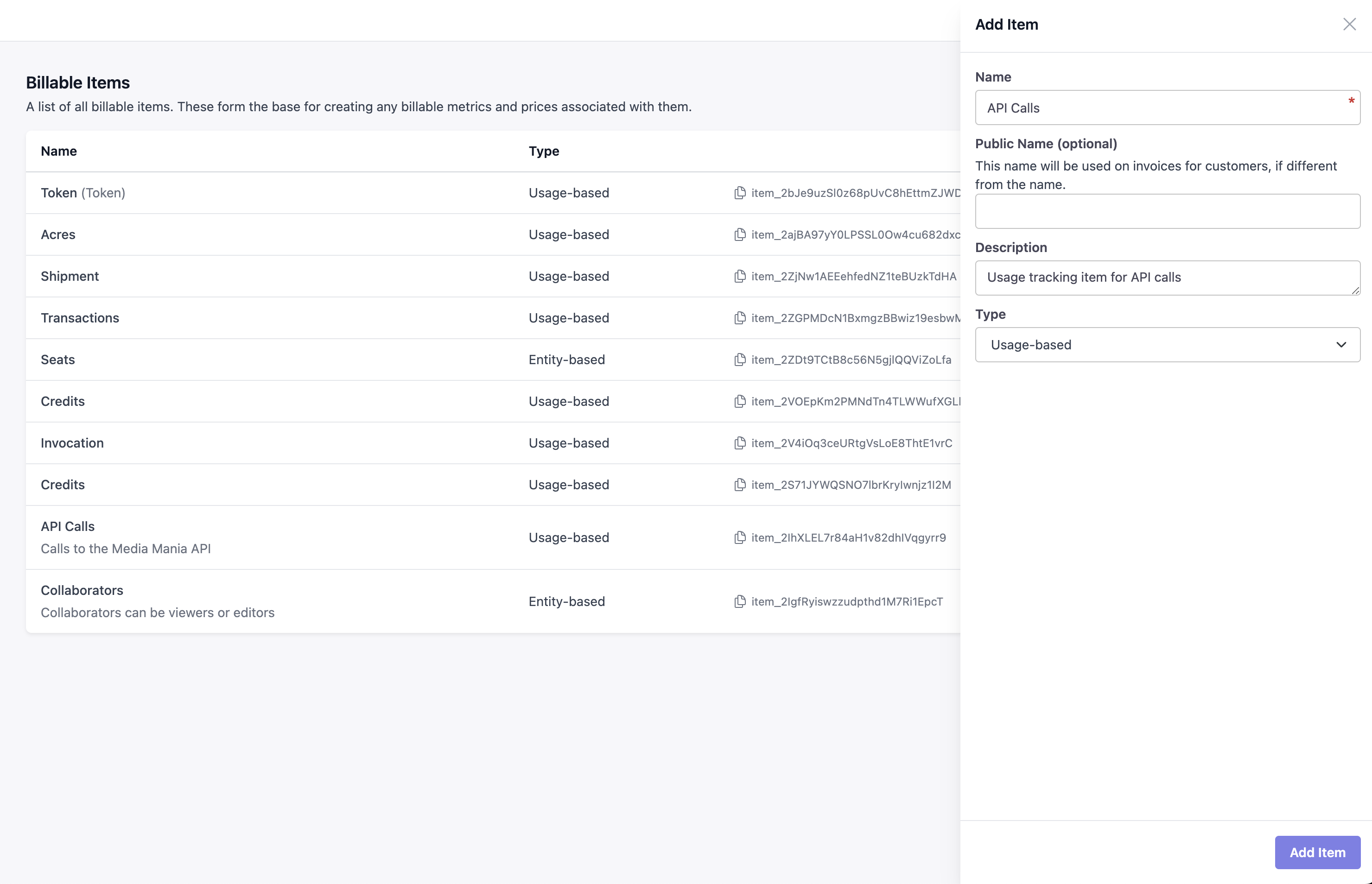 Billable items in Maple help track distinct entities for which you would like to track credits for in your application. For example, this could be “API Calls”