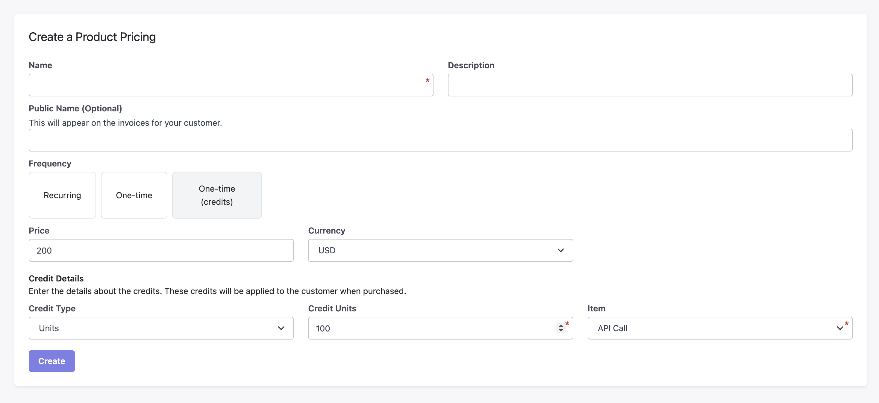 Maple supports the creation of pricing plans that add credits for different billable items for the customer. To get started with creating credits-based pricing, go to Products > Add New Product Pricing