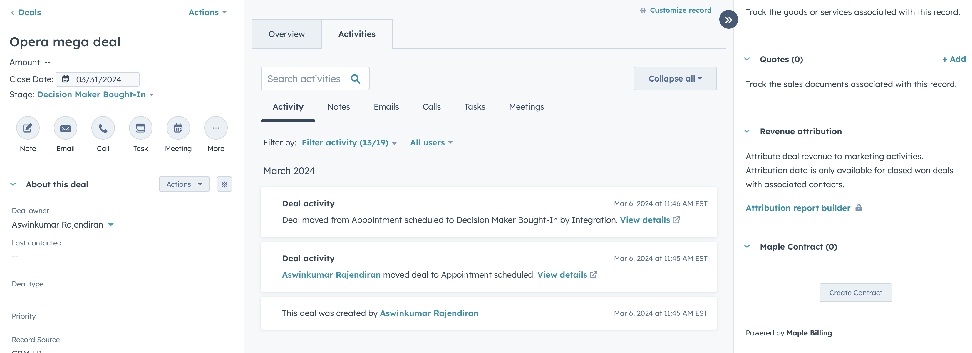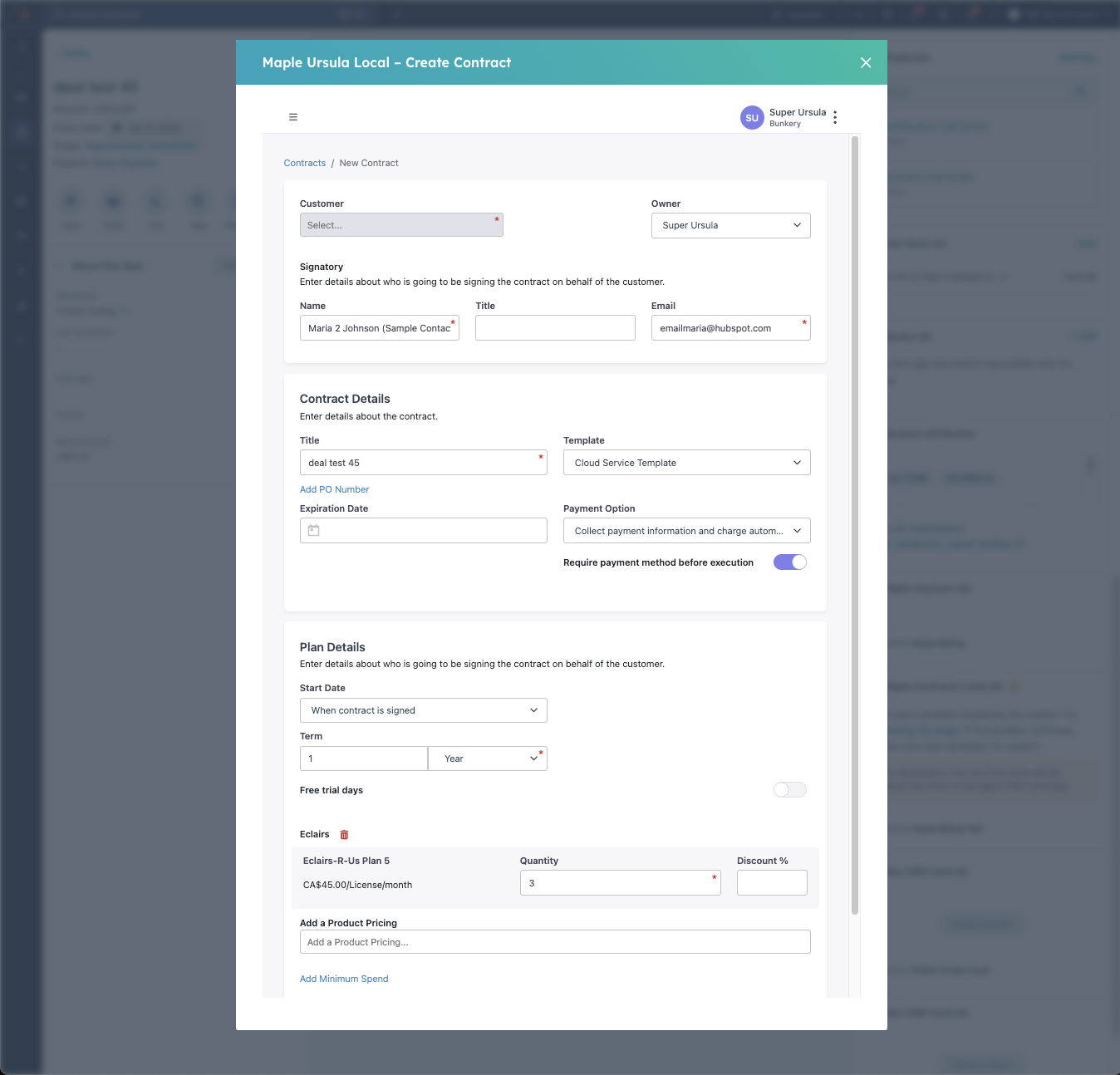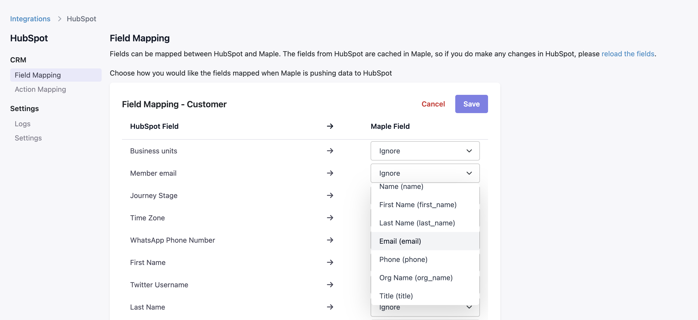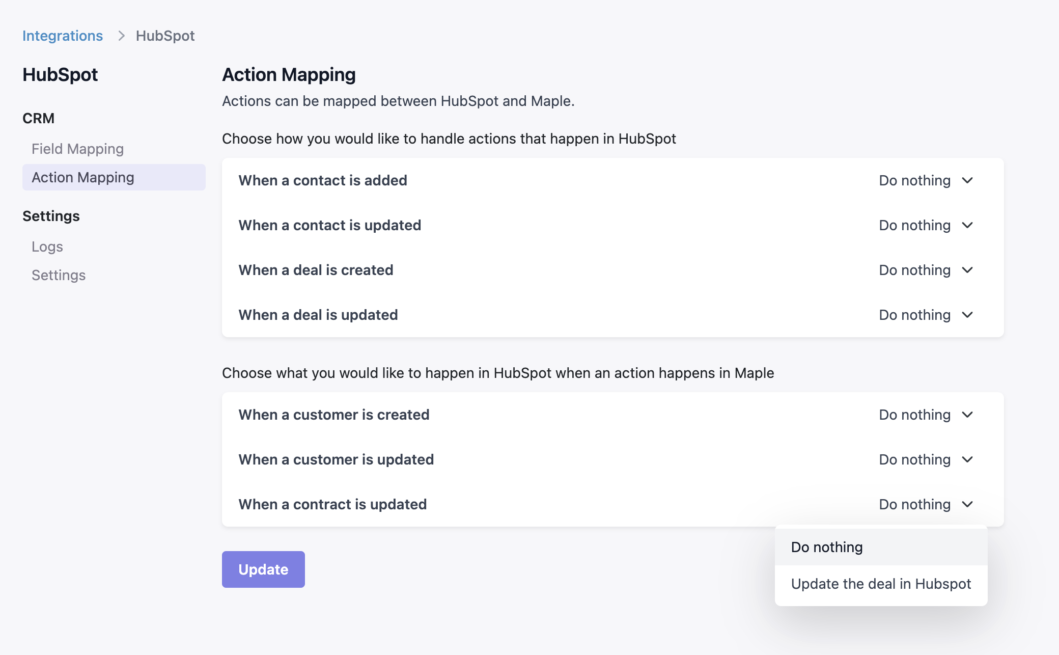 Maple allows for Action Mapping and Field Mapping with HubSpot for a highly customized integration. The Action Mapping determines what happens in HubSpot when actions happen in Maple and vice versa. You can configure either Maple or HubSpot to be the source of truth on the customer or contract information.