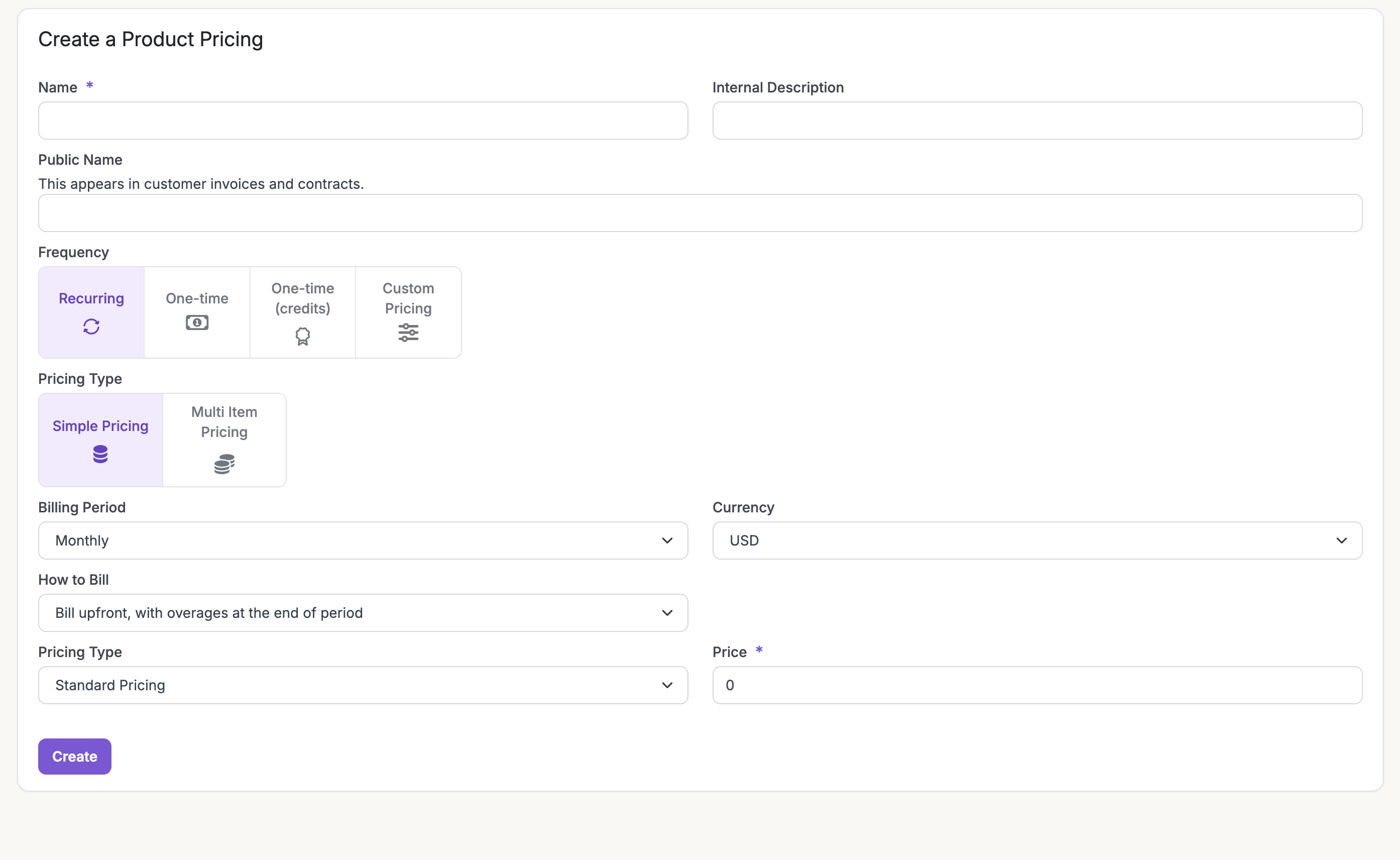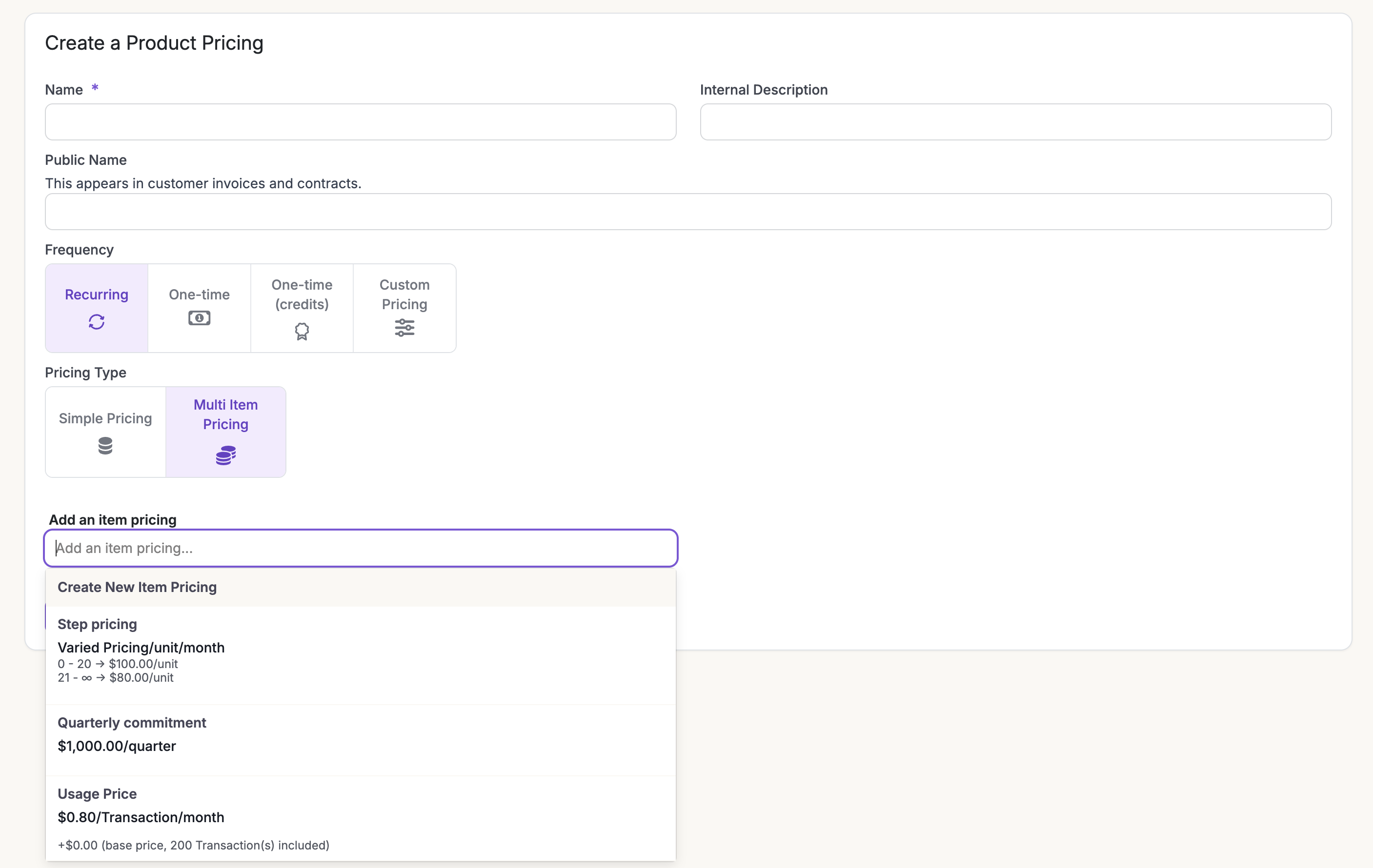 This represents a plan for a product. A product may have several options for pricing based on different currencies or billable metrics. Product prices can be recurring (for subscriptions) or one-time charges such as a setup/implementation fee or credit units for any billable item in your application. To add a product pricing, click on “Add New Pricing” under the specific product and follow the steps to add prices for components of the plan.