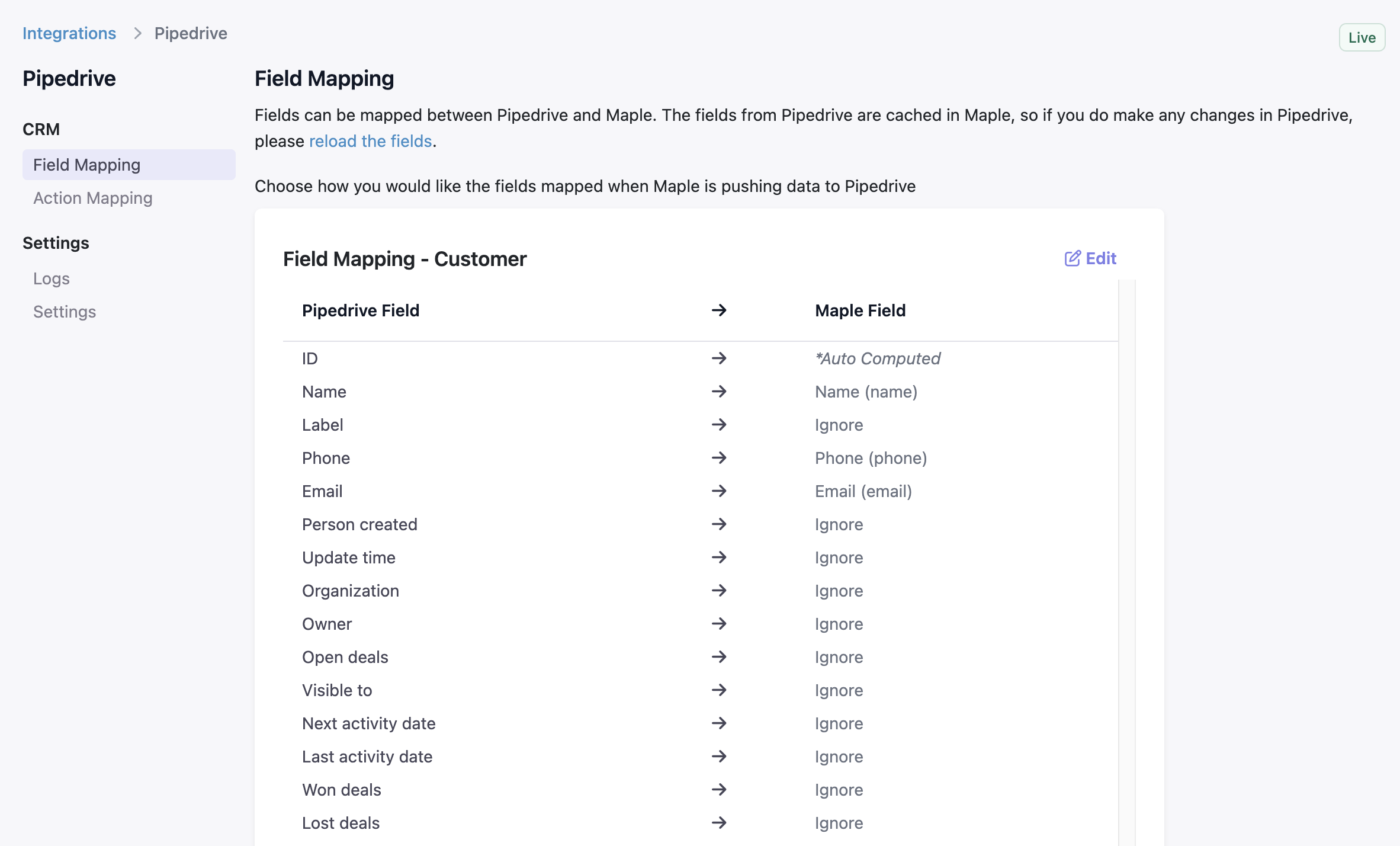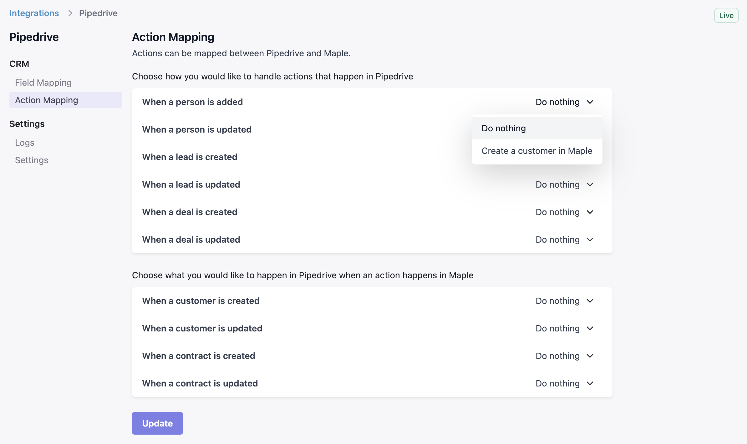 Maple allows for Action Mapping and Field Mapping with Pipedrive for a highly customized integration. The Action Mapping determines what happens in Pipedrive when actions happen in Maple and vice versa. You can configure either Maple or Pipedrive to be the source of truth on the customer or contract information.
