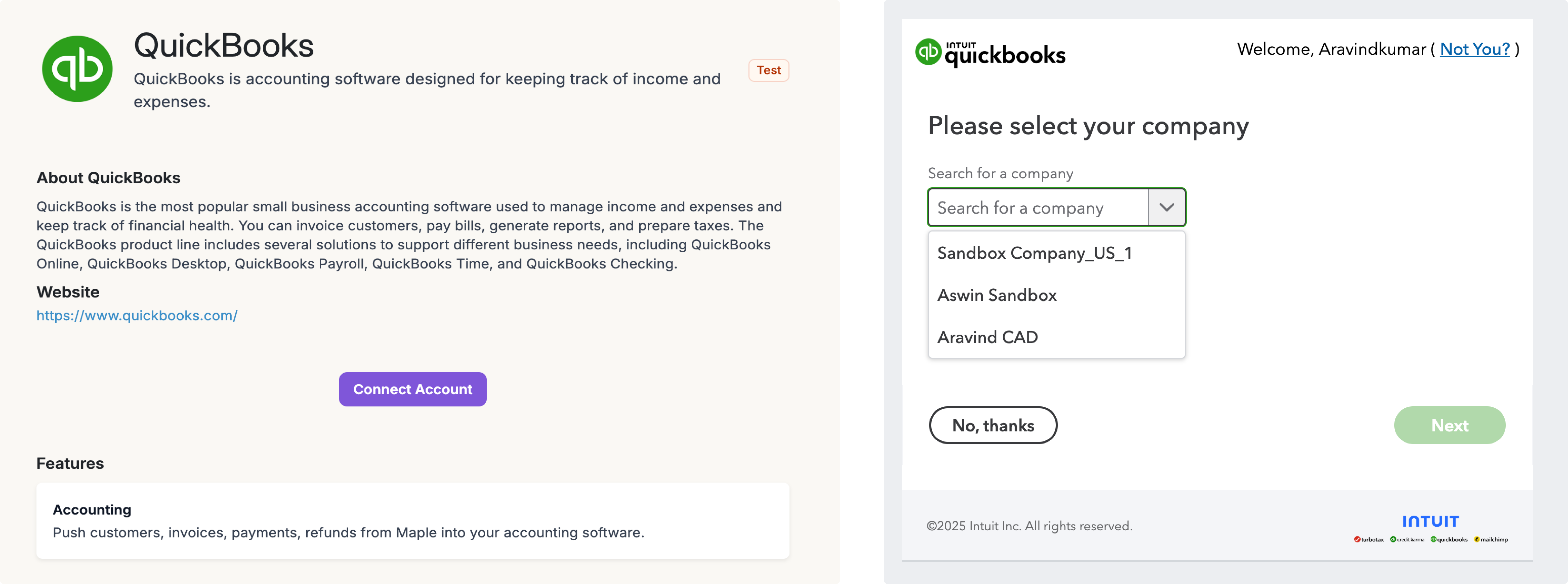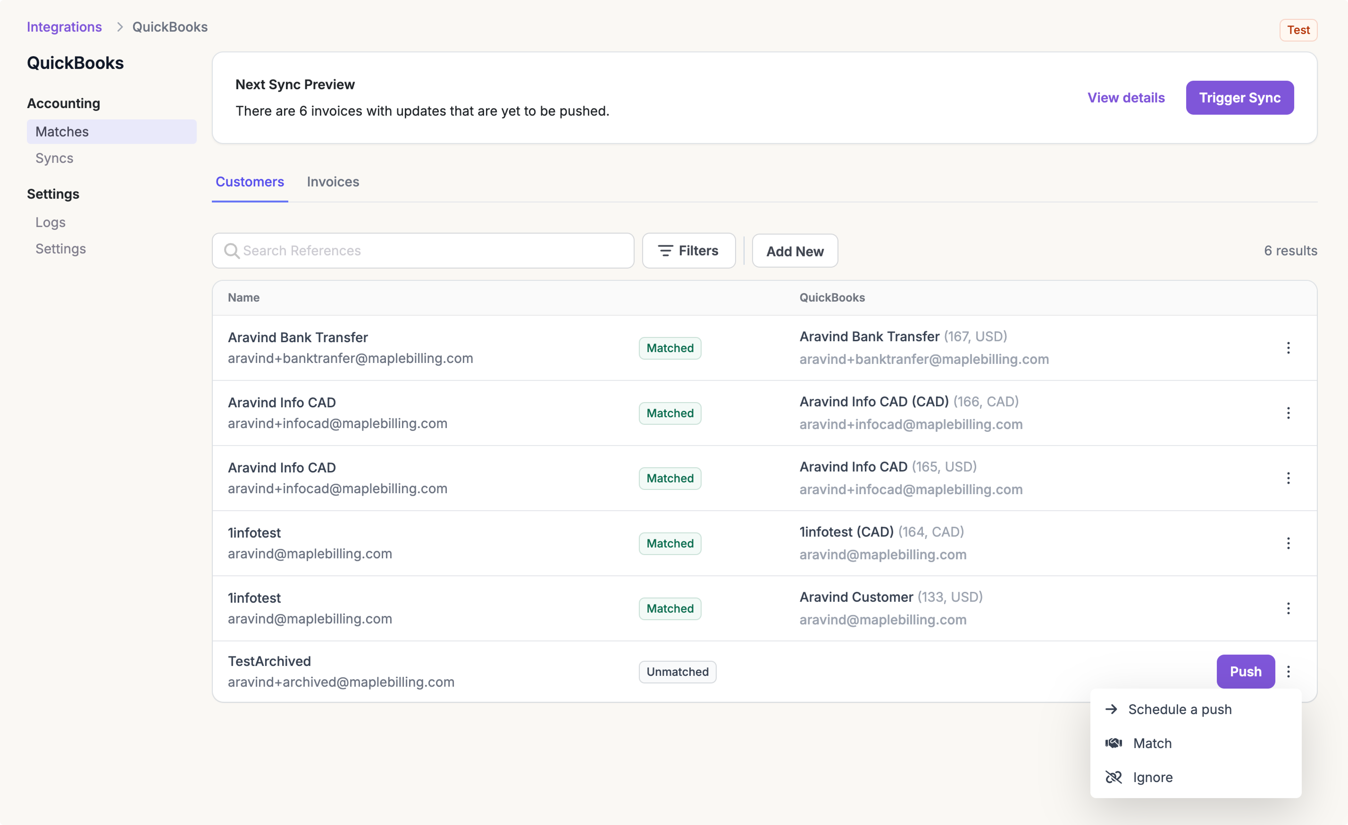 Maple allows you to easily map customers in Maple to those in QBO. Once the QBO account is connected,- Click on Matches > Customers
