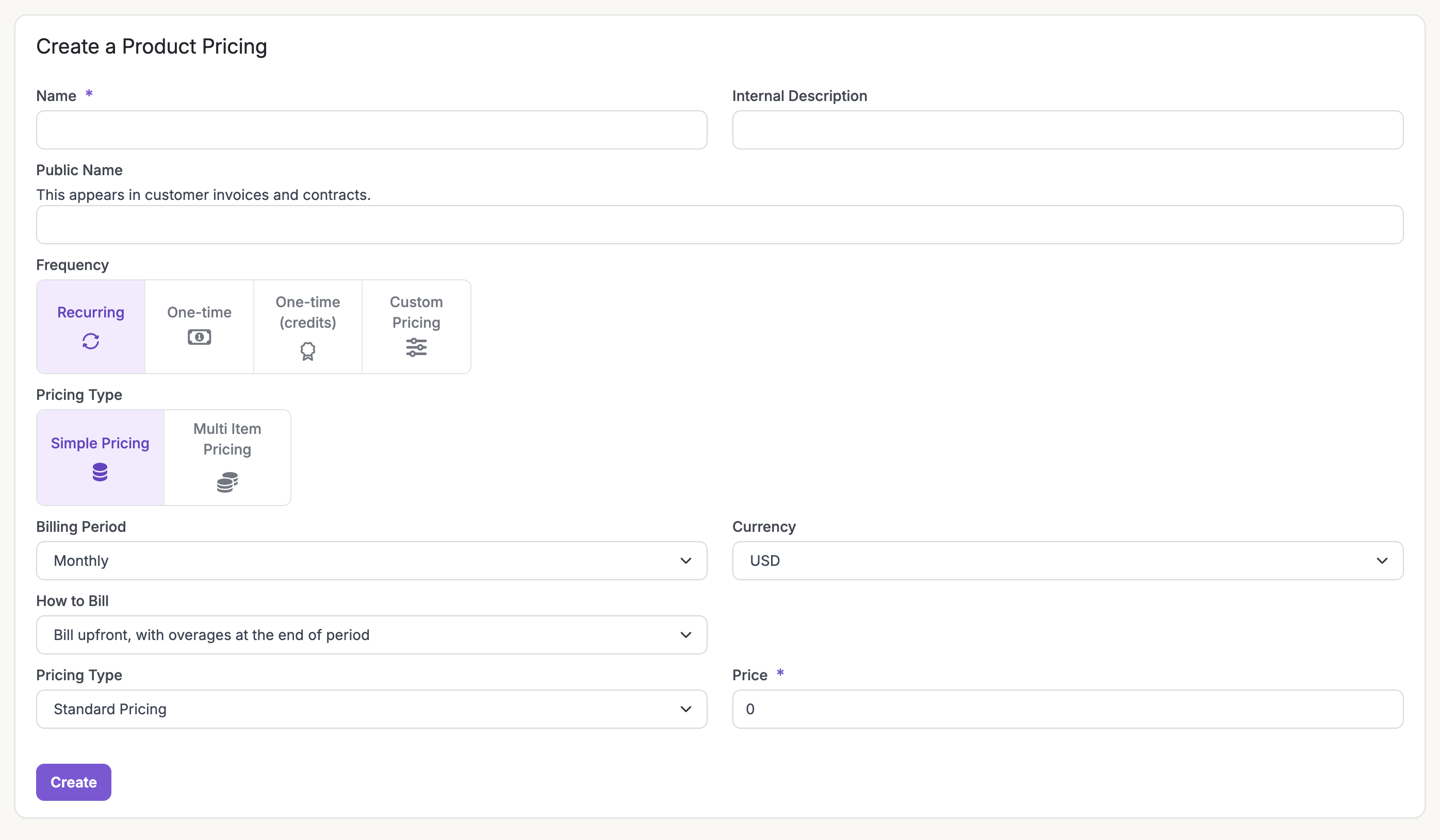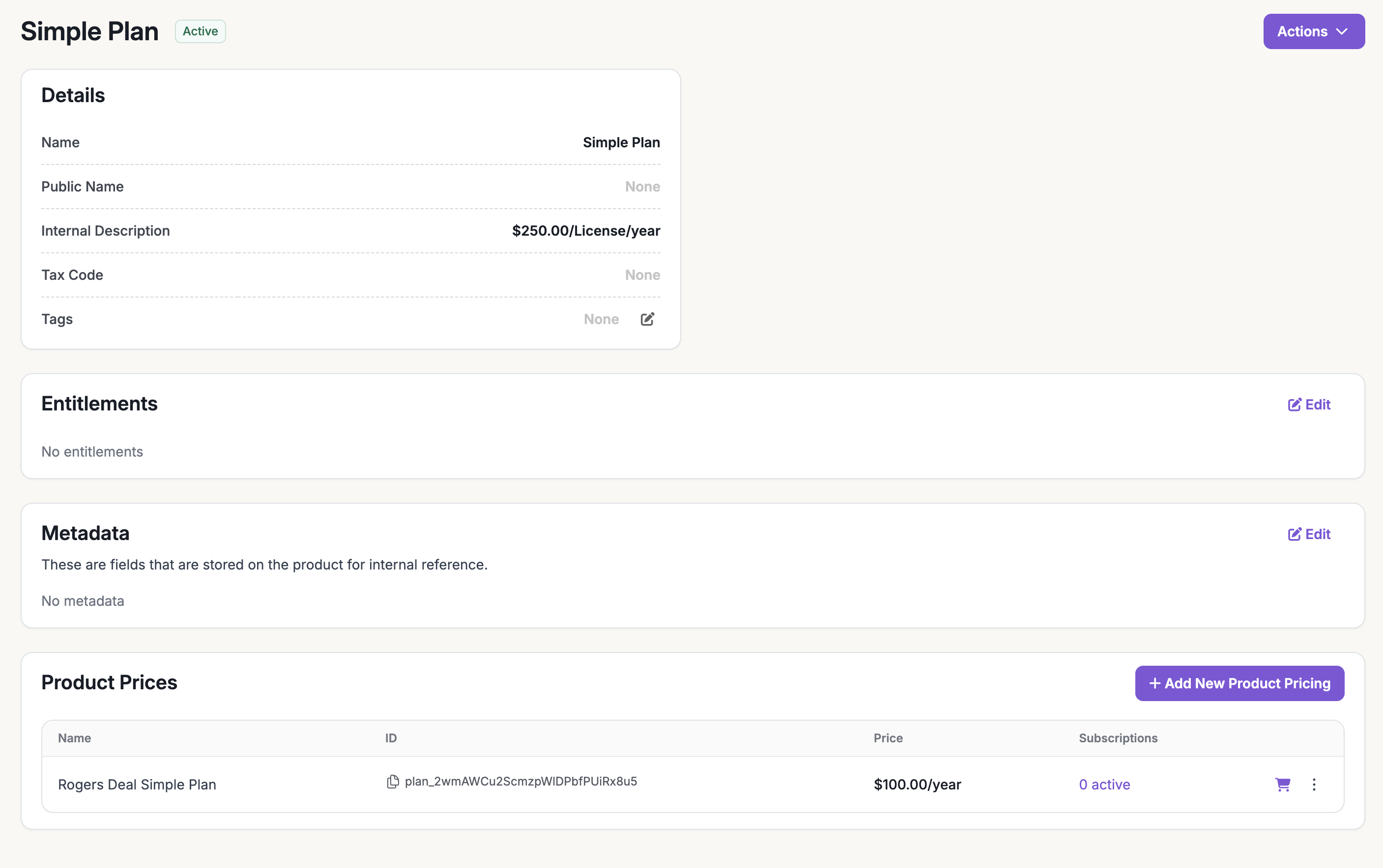Under the new product, click on ‘Add New Product Pricing’ to create a plan. You can achieve this with the API as well, if needed.
