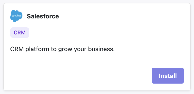 To get started with the Salesforce integration, select Integrations > Available Apps > Salesforce