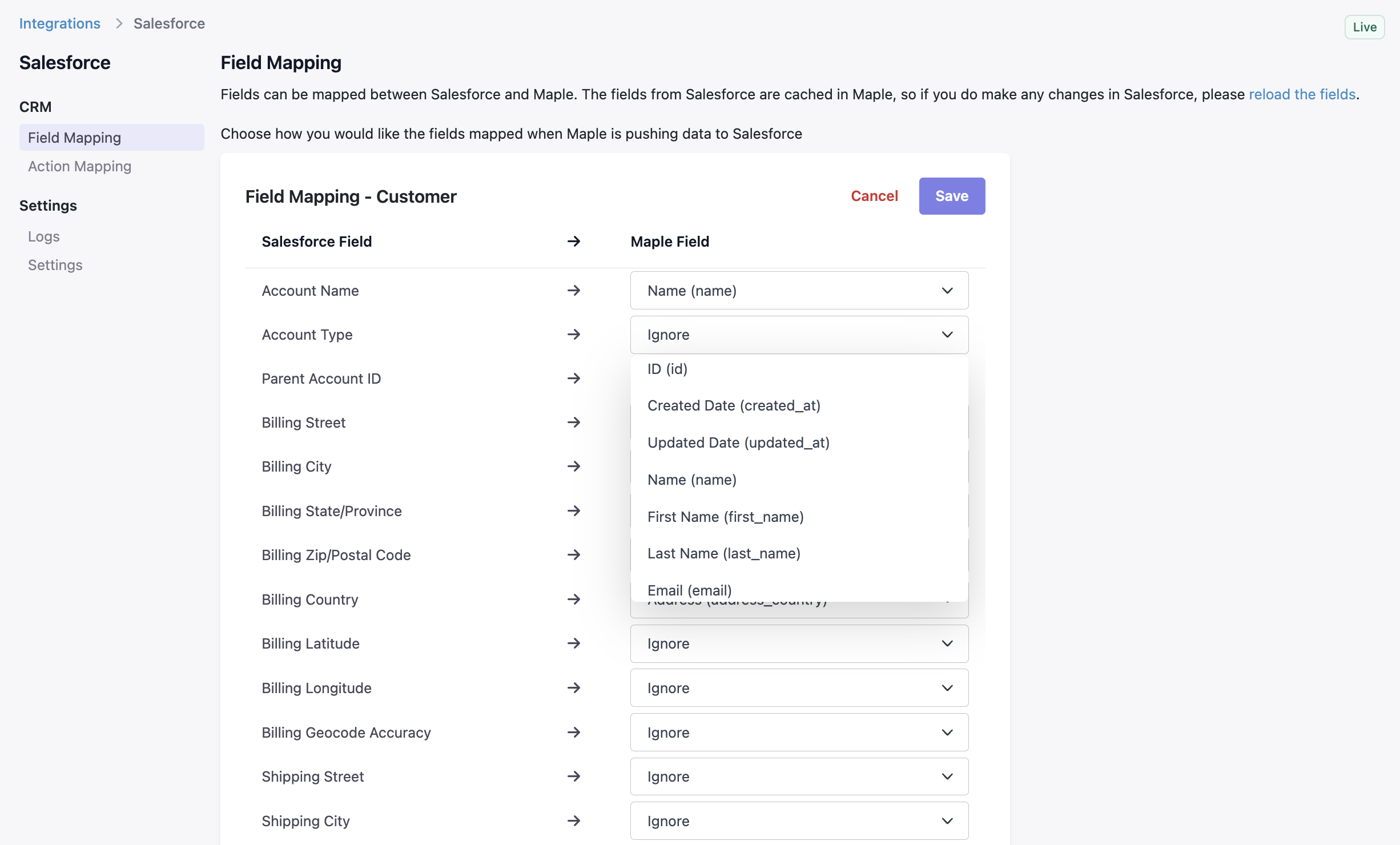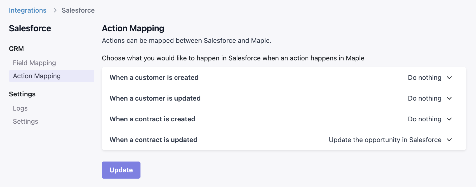 Maple allows for Action Mapping and Field Mapping with Salesforce for a highly customized integration. The Action Mapping determines what happens in Salesforce when actions happen in Maple.