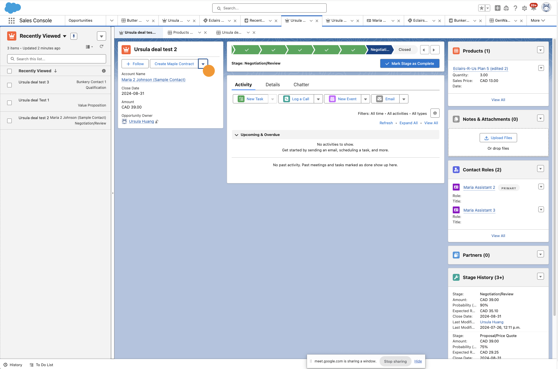 Salesforce can be configured to automatically launch Maple contracts through the use of custom buttons. Once set up, you can launch the creation of Maple contracts right from the Salesforce Opportunity Page.