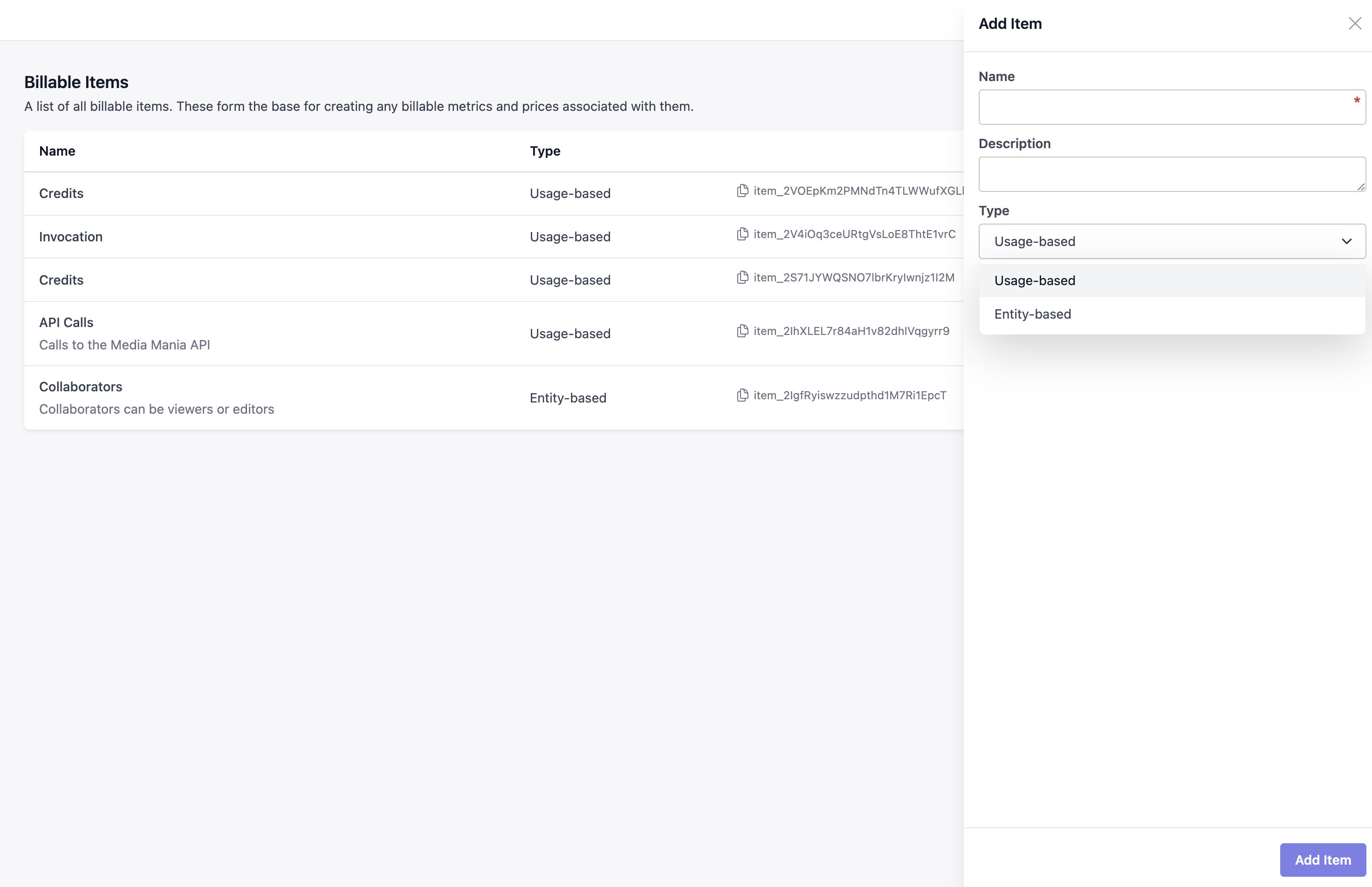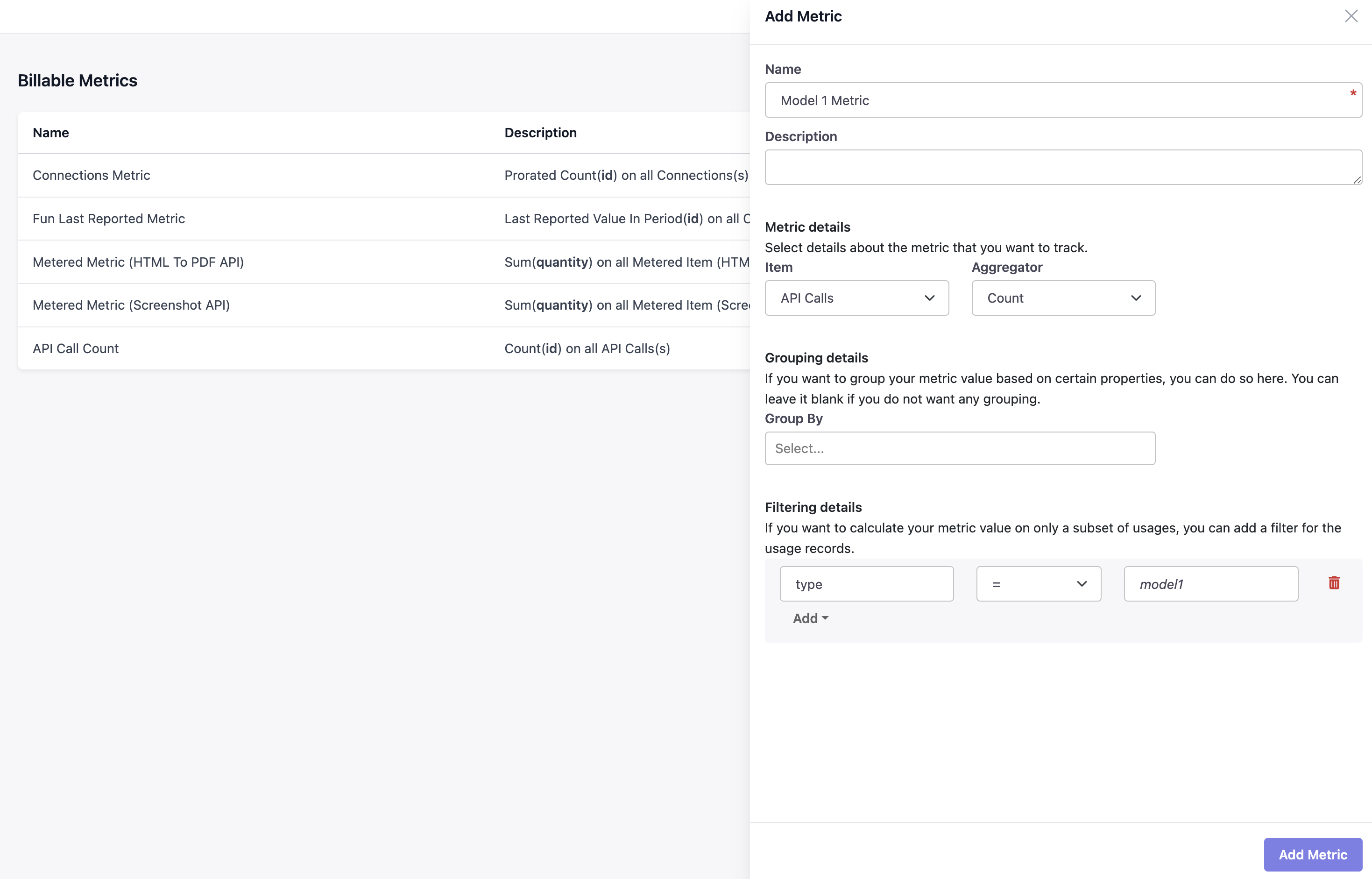 Maple supports metering of more transient usage-based items or more persistent object-based items in your product. Maple manages these two concepts distinctly because they made a difference when tracking MRR for your business. Revenue generated through object-based items (such as seats deployed) count towards recurring revenue while revenue generated through usage-based items (such as API calls) do not unless there are a minimum set of pre-purchased items. With both events and objects synced into Maple, you can set up billable metrics that can be aggregated over metadata captured in theproperties