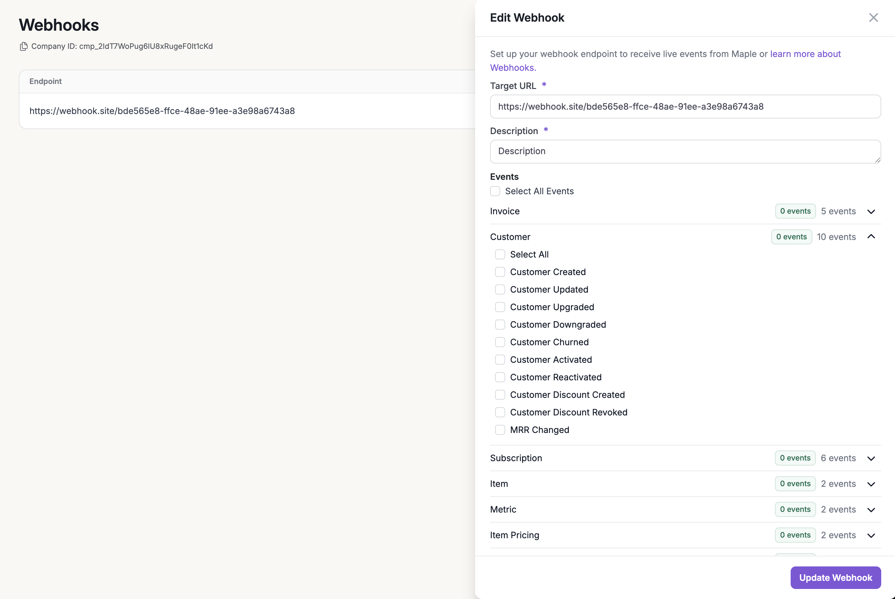 Webhooks can be enabled and configured through the Maple web application under the Developers section. You can subscribe to specific events or all events.- Go to the Webhooks sub-section under Developers.